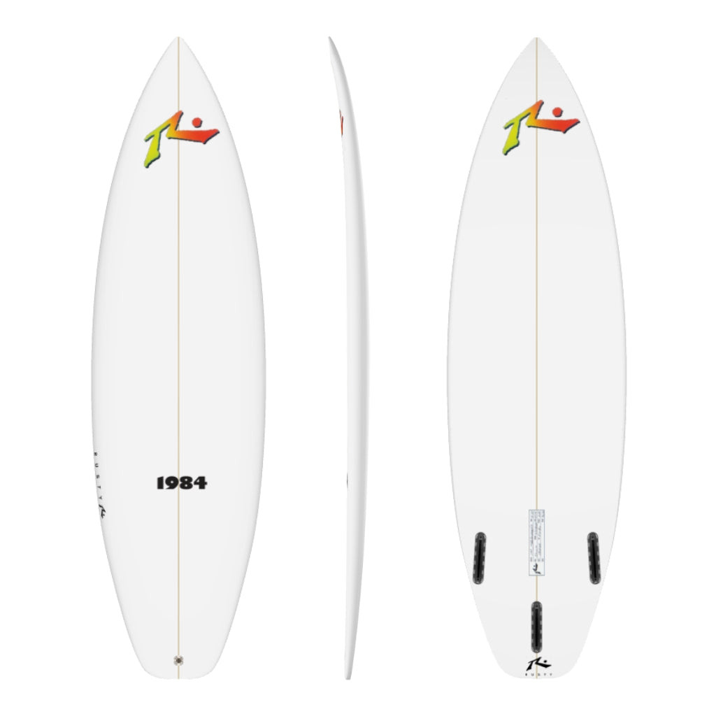 Occy's board from his bust-out year. The Raging Bull was unstoppable on it. The '84 is also considered a very user-friendly, versatile design. Flat bottom under the front foot with a shallow vee and scooped panels through the fins and lifting off the corners of the tail. Relaxed rocker, flat deck, beak nose, and boxy rails.